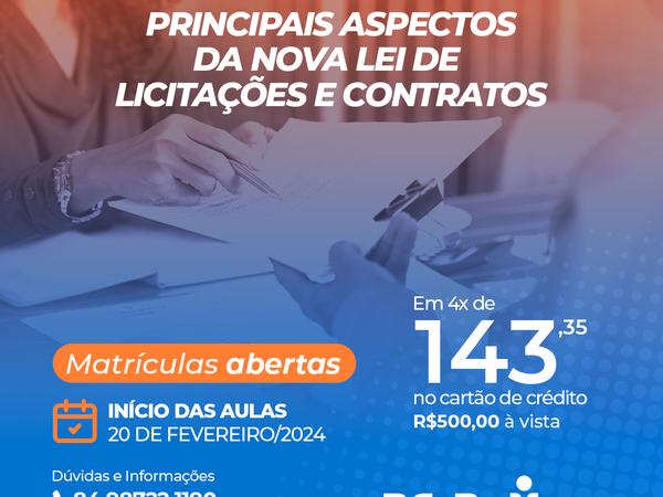 Inscrições para Curso Principais aspectos da Nova Lei de licitações e contratos 17 de Janeiro de 2024 Saiba mais →